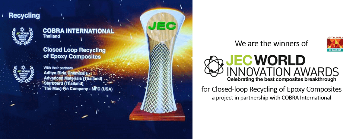 Aditya Birla Chemicals, a leading manufacturer of epoxy resins & advanced materials and COBRA International, one of the world’s largest OEM manufacturers of composite products for Water Sports, Automotive, Marine and Civil Engineering has won the 2020 JEC Innovation Award for their latest sustainability project Working in partnership with COBRA’s customers Starboard and Maui Fin Company (MFC), the joint team has successfully integrated novel recyclable epoxy resins (Aditya Birla Chemical’s proprietary Recyclamine® technology) into series production of water sports components and initiated a closed-loop process to re-use the recovered reinforcement fabrics and thermoplastic polymers produced when the epoxy composite is recycled.